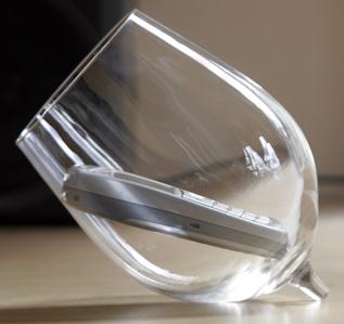 Sometimes a picture really does tell the whole story. Bahbak Hashemi-Nezhad of Sydney has, uh, “developed” this cellphone amplifier out of the top of a wine glass. He sites that more and more people are using their cellphones as alarm clocks these days, and this will help give your getyourlazyselfoutofbed noise a decibel boost. I, personally, use an old-fashioned radio-alarm clock. But I could see myself using this because when I get home, my cell phone lives in my bedroom, and sometimes I have a hard time hearing it in the living room with the TV on. Even though this is a very elegant-looking solution, this wineglass would just roll right off the top of my very busy dresser. BoingBoing made the nice suggestion of trying to integrate your charger into the bell. I think I would try to make a sturdier base, in addition to including the charger cord. This would cut down on it’s elegance a bit, but it would increase it’s functionality a ton. At any rate, Bahbak, your broken wine glass sure is getting a lot of press.
