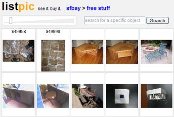 This is all fine and dandy, unless you are the visual type - in which case thumbing through hundreds of Free Stuff posts can get annoying. Enter: ListPic. ListPic goes through the various sections of craigslist and sucks out the entries with pictures. Clicking on the picture will get you the text that comes with the post, and the whole set of pictures is dynamically resizable. Very very handy for the visual free stuff hunter in all of us.