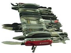 If I ever meet Richard Dean Anderson (that’s MacGyver, for all you non-fanatics), I should either have a large strip of duct tape for him to autograph, or this: The Most Incredible Knife. This “knife” has 85 tools on it, weights about 2lbs, and is over 9 inches long - packing almost every single tool that was ever on a Swiss Army Knife in to one… uh, package. And while this object would probably be fairly useless in any situation (how does one use a knife with a handle that is 9 inches wide?), it does not mean that this thing isn’t COMPLETELY FRIGGIN’ AWESOME. Because it is.