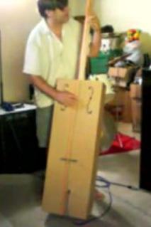 This is a great example of how simple musical instruments can be made with a little ingenuity. This guy made a standup base out of a cardboard box, a plank of wood, some weed-whacker string and a piezoelectric buzzer as a pickup. It sounds pretty good for the materials it’s made out of. There is a video and a short description here.