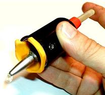 This is a great idea. Dan Lockton, over at Instructables, has hacked up a small glue gun and made it into a precision glue gun. Hot glue is notoriously messy and hard to handle, and not very suitable for smaller applications. Giving this gun a smaller nozzle (from a ballpoint pen), the resulting glue stream is more manageable.