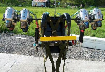Man, you know I’m weary of strapping a jet to anything that wasn’t meant to have a jet strapped to it… say, like YOUR BODY. And from what I see here this guy has all the makings of a disaster. For one, he has an awful cookie-cutter flash site set up here. This is your official Bad Music Warning. He is proposing to sell these guys for $200,000. WTF? Do you make these jetpacks in that shed we see in the background of this picture? On the website there is a section called “Test #2″ (I would link to it, but it being a crappyFlash site, I can’t). And there is even a video of him tied down to a wooden structure for “safety”. What ended the test? A wire got sucked into the intake. Great. Awesome. Maybe you should have checked for loose wires before you tested? Better yet, maybe you should STOP MAKING JET PACKS IN YOUR BACKYARD??