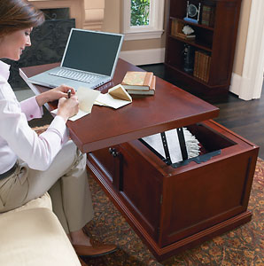 Here is an interesting product from Brookstone that may be an easy project for the enterprising furniture hacker who currently lives in such a small space that they cannot fit a desk and a coffee table in their small space: but wants both. I think this is a cool idea, but since I don’t really need one, I’ll leave the work to you. I would imagine that this kind of special hinge could be found readily. Now all you need is some box-style coffee table, a saw, some screws, and the tolerance for undertaking a project of this magnitude in your cramped, small-ass apartment. Perfect.