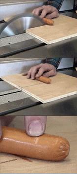 SawStop: The Best Way Not to Cut Stuff - now including *Hot Dogs* and *Your Finger*! Thanks to some fancy detection assembly that includes the blade itself, this table saw can sense when it has stopped cutting wood and has started cutting something conductive (ie whatever bodypart you’ve got in there) - and within 5 milliseconds, shoves an aluminum block into the blade both stopping it and retracting it from the table. SawStop’s website has some cool videos that use a hotdog, and all joking aside, this thing really works. The blade ends up barely nicking the dog, as you can see to the left. Videos are here: (.mov / .mwv). Another company that tested this product says that 50% of the time, the blade is ruined - and 100% of the time the aluminum stop block is ruined (REALLY?). But, the whole detection/stopping mechanism is easily replaceable, and only costs $70. Now, the whole system starts at $2799, which may be a little steep… but just think of it as finger insurance.