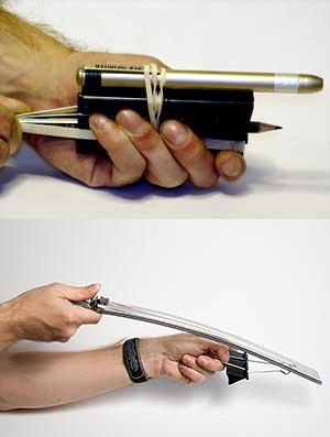 I know office life can be boring, but these guys have taken time wasting to a whole new level. The potentially hazardous level, that is. In a surprising amount of detail, these guys from Norway have documented the building process for about ten Office Guns - and have also figured out average and maximum projectile velocity (with high speed cameras), range, and loading time. Pretty good for a bunch of clips, rubber bands, and pencils. And if this wasn’t enough, they even did CEP accuracy tests, and penetration tests using ballistics gel. Whoa! Their “Super Maul” gun can send a pencil through an empty can of soda, so watch out. I usually encourage people to get out and make whatever it is I happen to be posting about - but in this case, just reading the website will suffice.