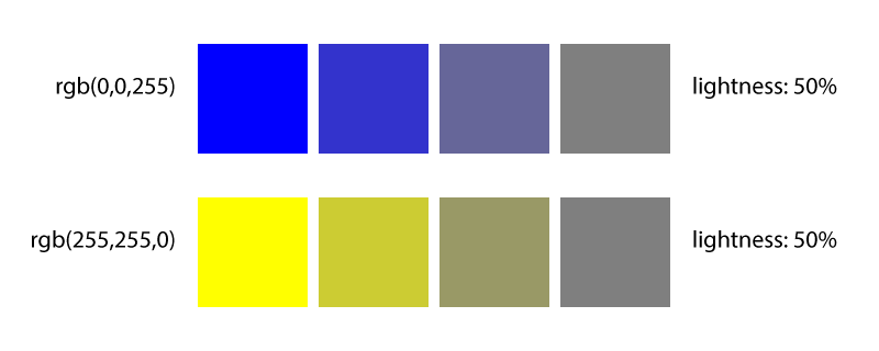 The result of our desaturation process resulted in 50% lightness for each color. Which gives us our answer: the blue and yellow color above are just as light as each other.