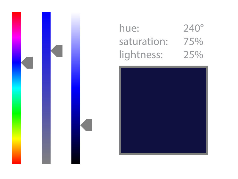 Using HSL to define a color is conceptually much easier than using pure RGB values - which means HSL passes our Intuitive Mixing requirement. And even though we can't specify HSL values for screen design, they are easily translated to RGB values (once we've got the color we want). Actually, HSL and RGB share the same conceptual color space - another way of saying this is that HSL is just all the RGB colors re-arranged in a more logical way.
