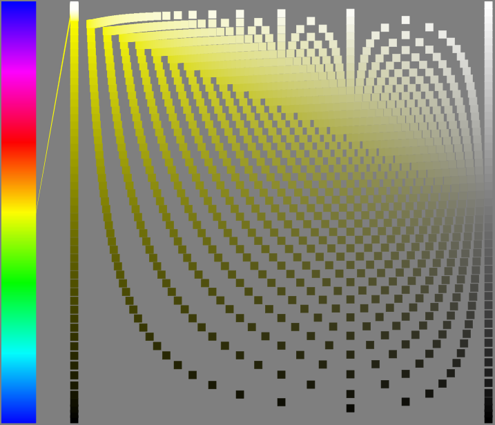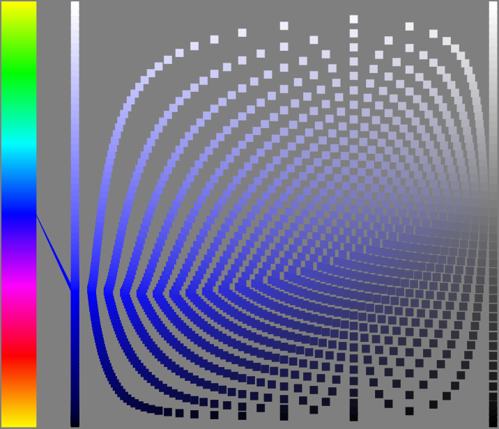 The hsLab tool also begins to show interesting saturation patters. Columns of color have equal saturation - but when combined with the lightness dimension, they form these interesting "tree ring" like patterns. Most other color pickers artificially stretch these colors into a square. The hsLab tool lets the colors fall where they may, which better highlights their relationship to other colors in both the saturation and lightness dimension.