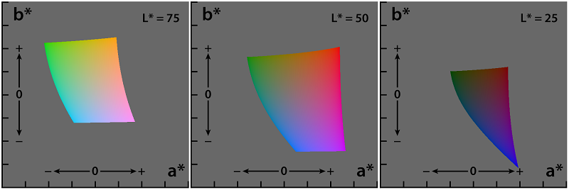 Here is a look at three different slices of the LAB color space at 75%, 50%, and 25% lightness. Remember, the hard edges of these color shapes are not actually hard... but the point is that the color space our eyes see is kind of curvy, in all three dimensions.