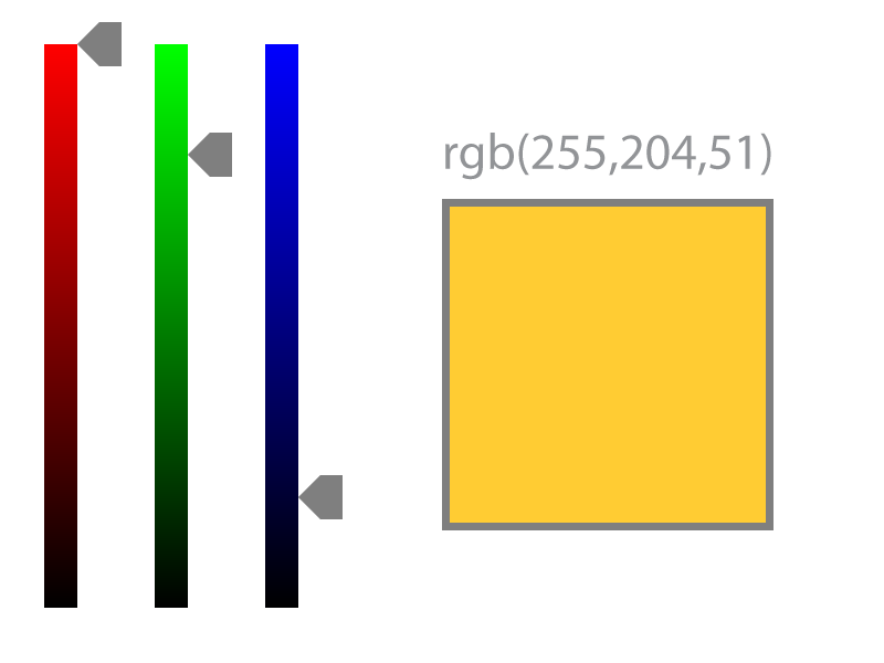 The reason the RGB color space is laid out like this is because it makes sense to computers. 256 happens to be a number that is stored well in computer memory, with no space wasted, so we're able to specify a large range of colors. Actually, there are 2563 distinct colors in the RGB color space, which equals 16,777,216. Each pixel on your screen is actually comprised of three sub-pixels: a Red, a Green, and a Blue. Each sub-pixel can be at lightness = 0 (all the way off), lightness = 255 (all the way on), or 254 steps in between. This is how more than 16 million screen colors are generated.
