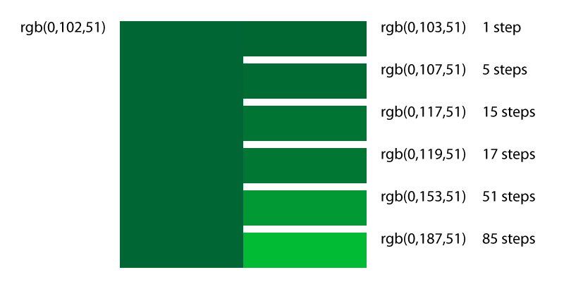 As we learned previously, the RGB color space can specify more than 16 million colors. The fact is, if you take two RGB colors that are one step different, and put them next to each other, it's impossible to tell them apart. Since RGB steps are 0-255, we can look at the factors of 255 to find step numbers that can traverse the RGB space without remainders. That is to say, if we start at zero, and step over a certain number of colors each time, we can land on 255 at the end.