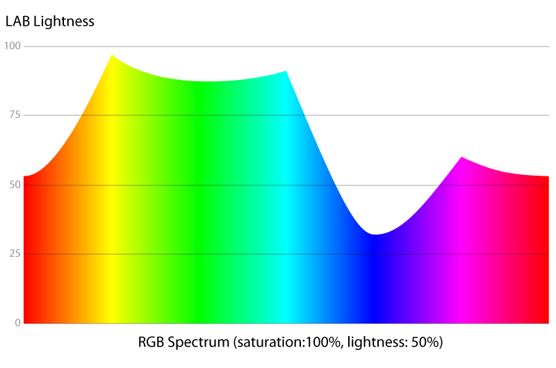 The L in LAB stands for Lightness. With a little math, we can take a RGB color, and find out a more accurate lightness that isn't based on the RGB cube. For example, now we could graph the relative LAB lightness values of the RGB Spectrum. By RGB Spectrum I mean the Hue selection component in our HSL color chooser... or, RGB colors where saturation = 100% and lightness = 50%.