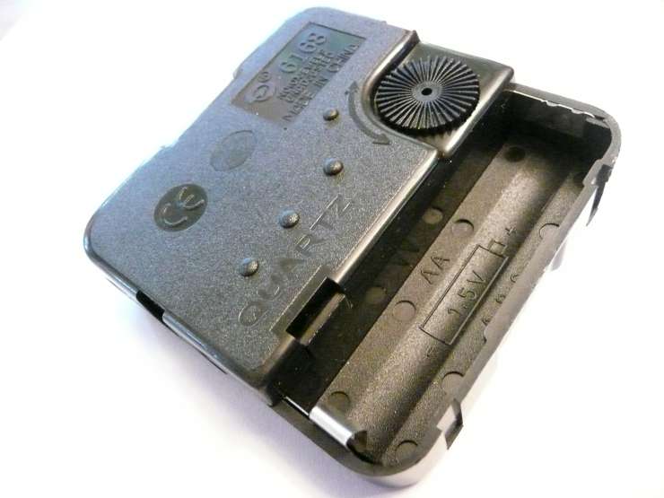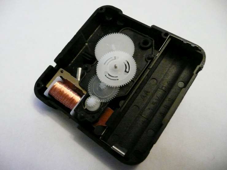 Carefully remove the only thing that is not gears - it's a small circuit board with a wind of copper wire. The circuit board lets off carefully timed bursts of energy from the battery, creating a momentary magnet out of the metal U piece via the wound copper wire.